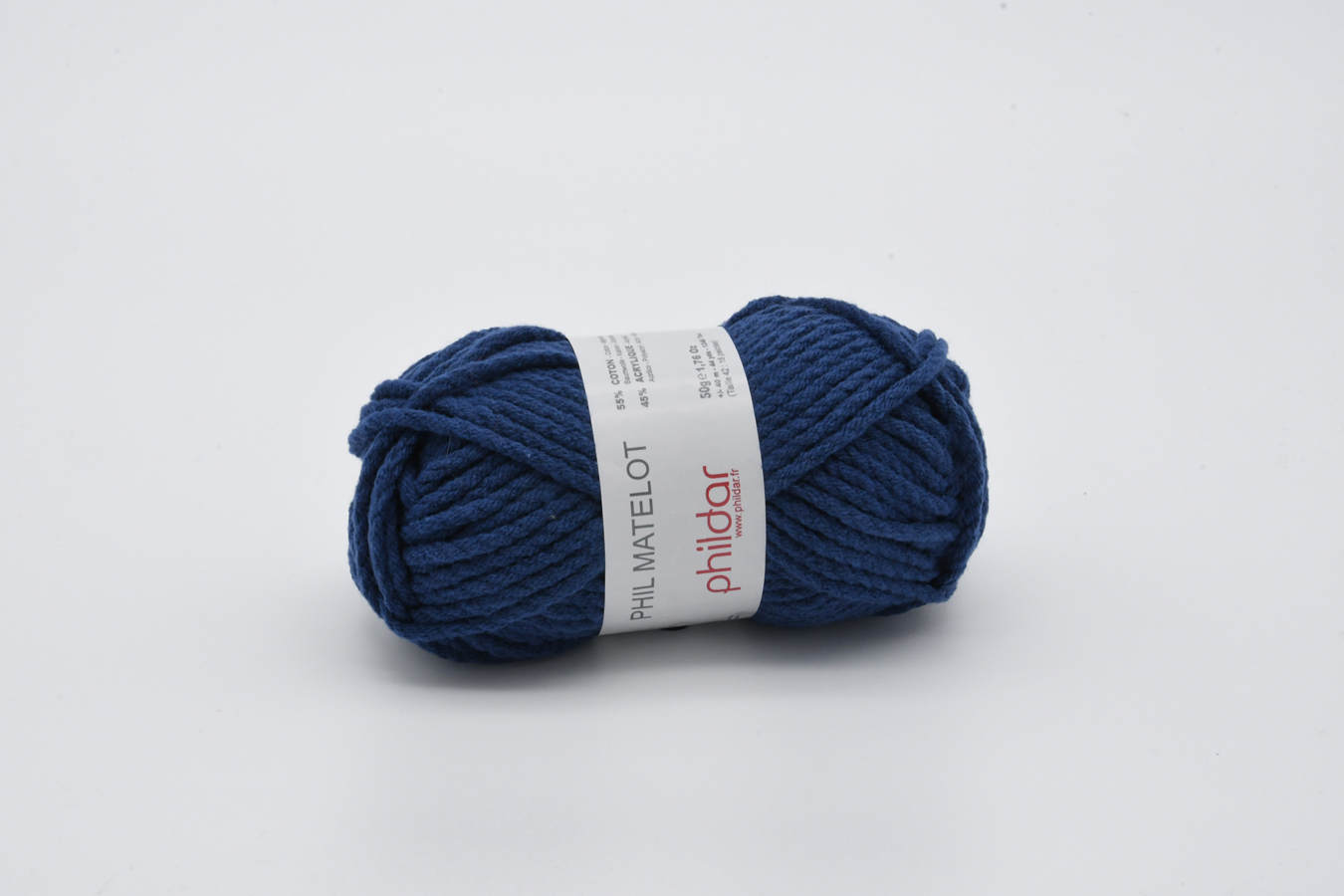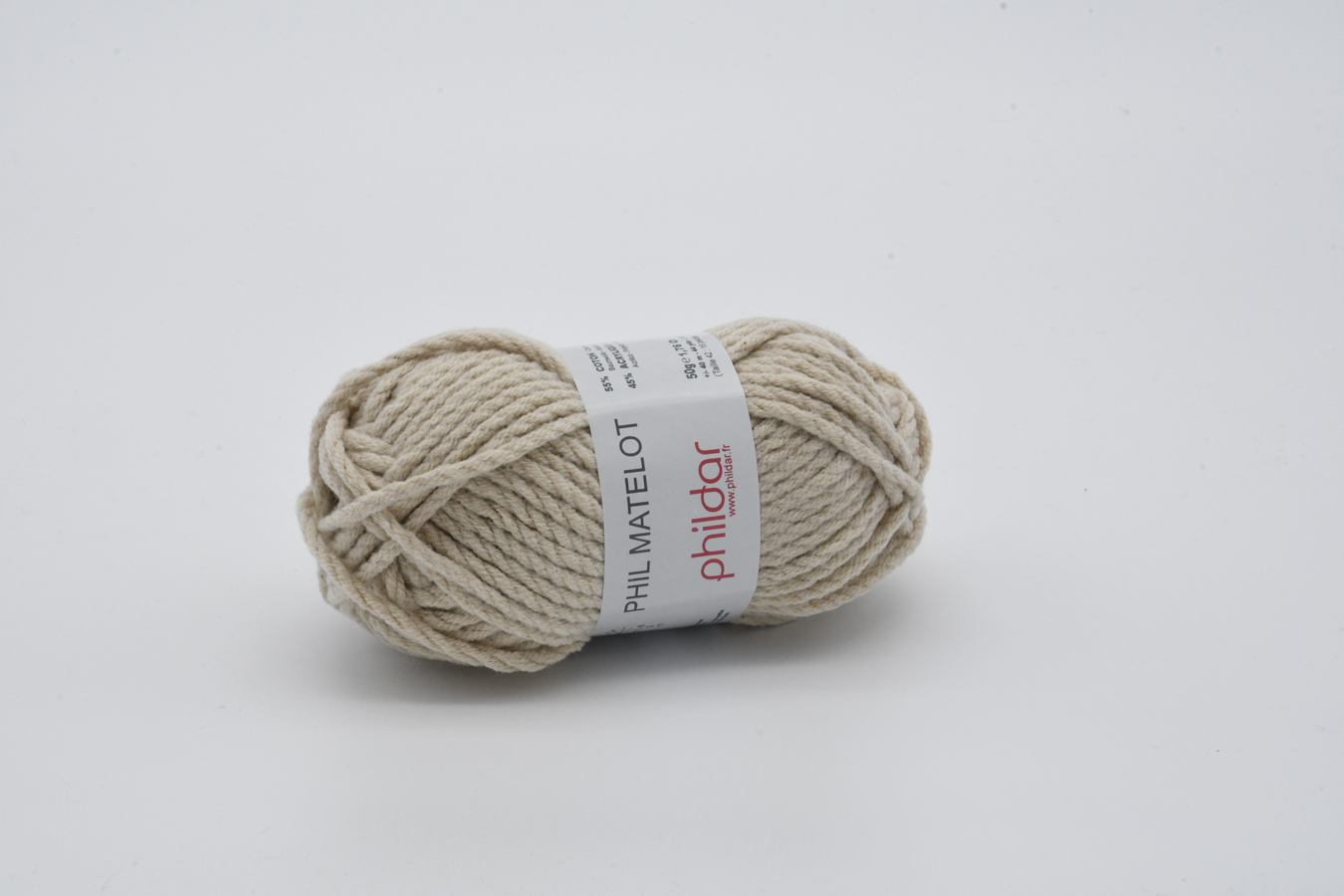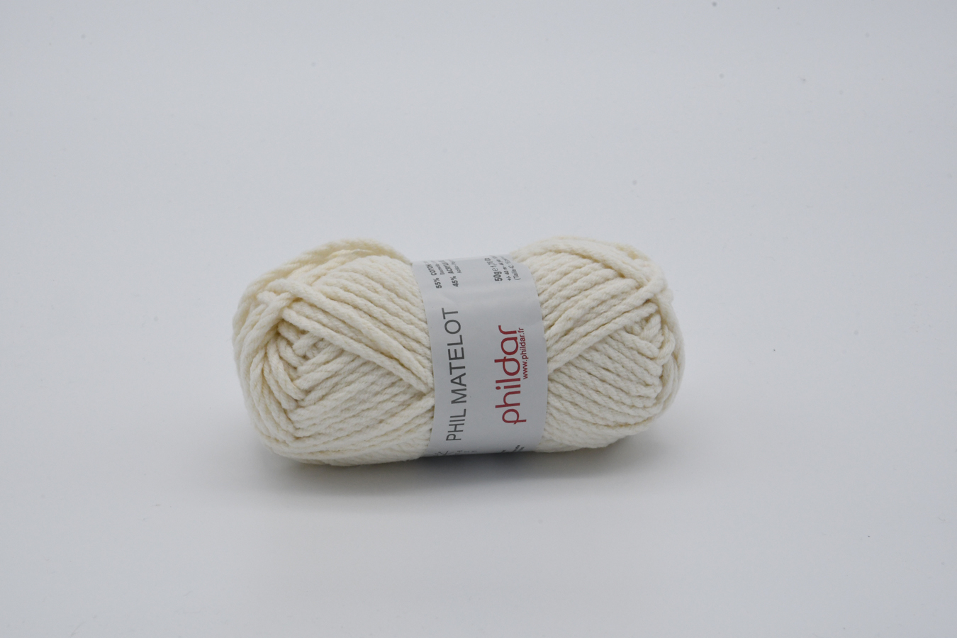 Pelote de 50g (+/-40m). C’est un gros fil blanchi. Idéal pour débuter au tricot ou au crochet.